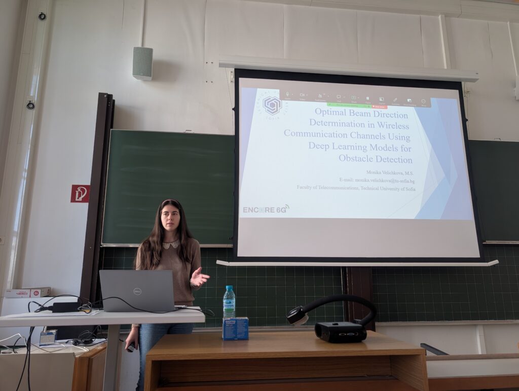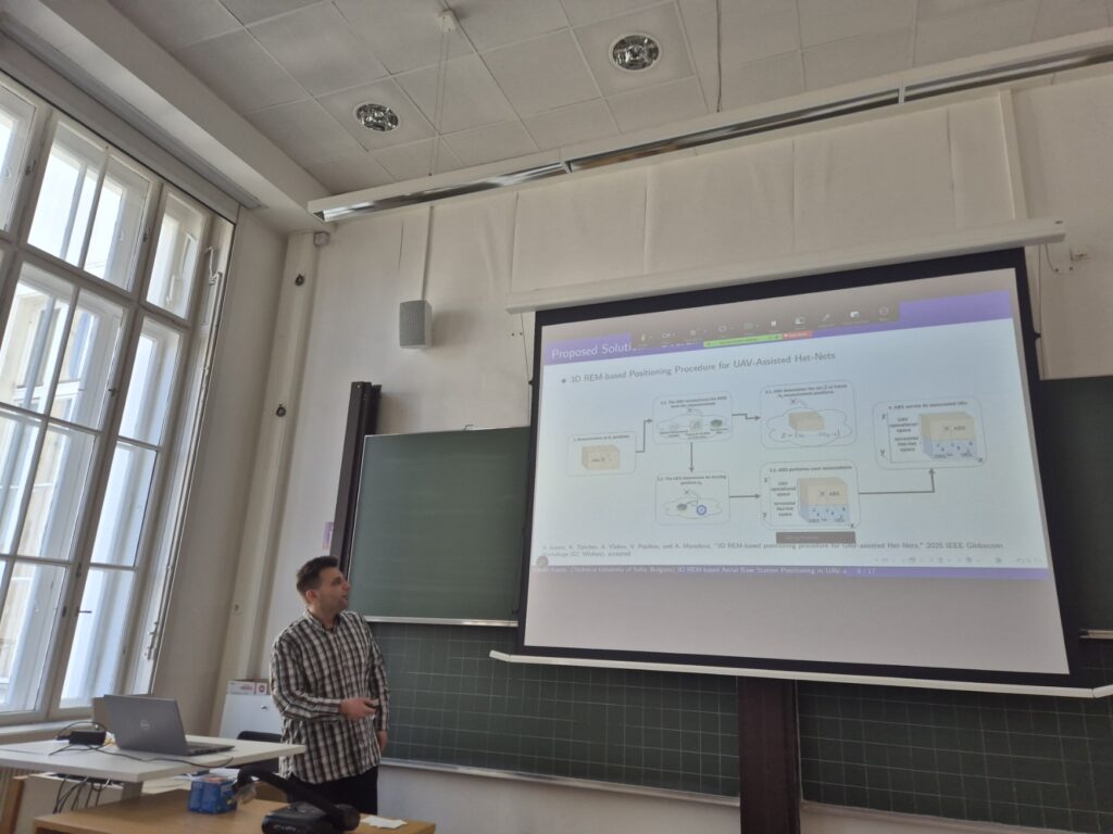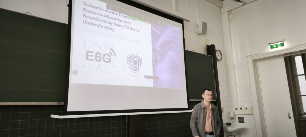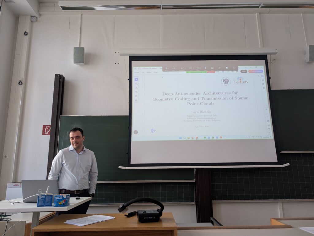 Our participation also highlighted the active contribution of TU Sofia to the workshop. Monika Velichkova presented work on optimal beam direction determination using deep learning models for obstacle detection, focusing on data-driven beam management and uncertainty-aware prediction. Dr. Antoni Ivanov presented 3D REM-based aerial base station positioning in UAV-assisted networks, exploring the use of three-dimensional radio environment maps for aerial network optimization. Slavcho Neshev presented semantic-aware proactive resource allocation and beamforming for QoS-critical wireless systems, addressing the integration of 3D scene understanding into proactive wireless control. Ivailo Bozhilov contributed with a presentation on deep autoencoder architectures for sparse geometry coding and transmission of sparse point clouds, linking compression, robustness, and efficient 3D content delivery.